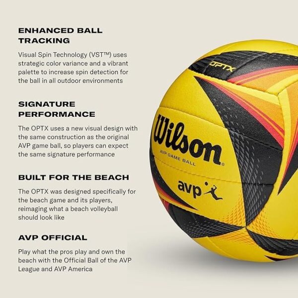 The Wilson AVP OPTX Volleyball combines professional-grade construction with a vibrant, eye-catching design. Built specifically for beach volleyball, this ball ensures consistent performance, durability, and playability. Officially sized and designed to meet AVP standards, it expands slightly with first use for optimal feel. Perfect for both recreational and competitive players who want to experience the same quality as professional AVP athletes.